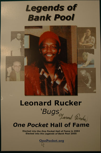 Poster is 12" x 18" and was signed "Leonard Rucker" by Bugs in silver marker on the occasion of his induction into the Bank Pool Hall of Fame in January 2006.