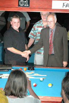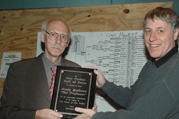 Grady Mathews -- the first inductee into the One Pocket Hall of Fame -- receives his plaque from Steve Booth