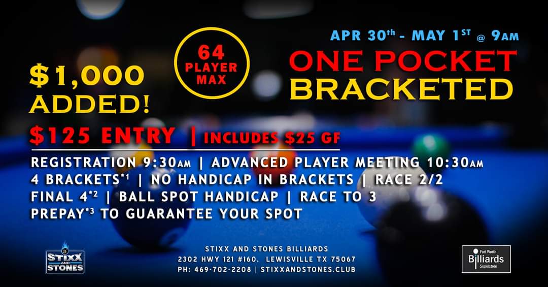 Stixx and Stones One Pocket Bracketed Tournament